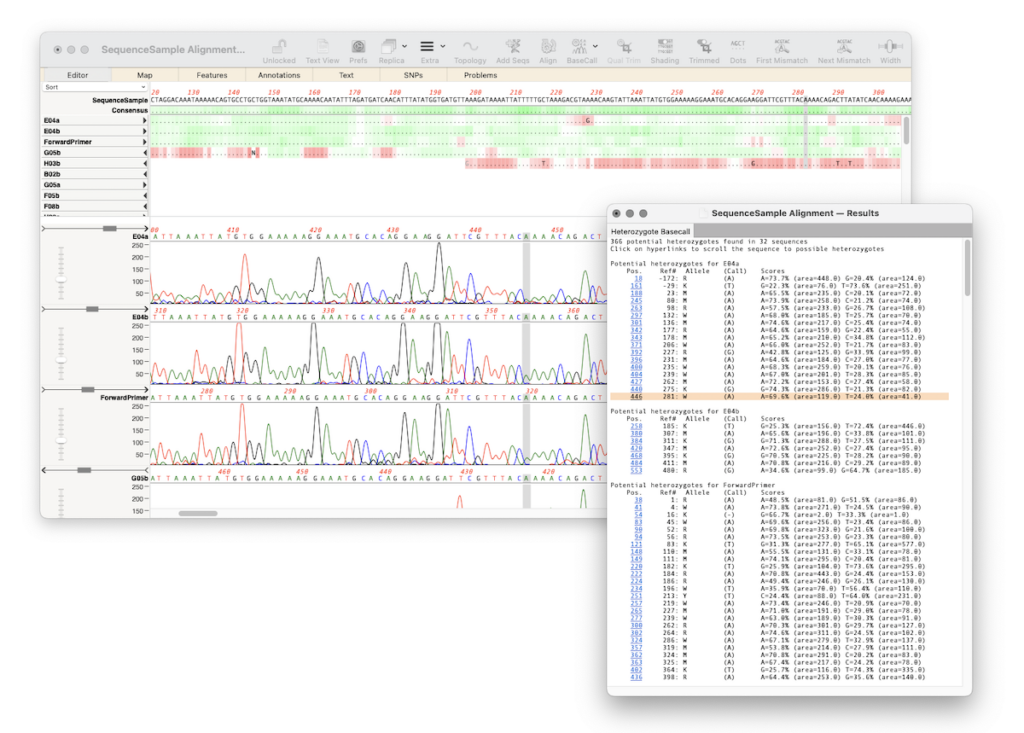 Most windows in MacVector are linked. For example if you open multiple windows using the REPLICA button, then click on a gene feature in the MAP tab, then the EDITOR tab will scroll to and highlight that gene. This is very useful for navigating around larger sequences, and is especially useful for large Align to Reference alignments. All Results windows are also linked to the main sequence (including the Het Analysis Results). So if you click on a result then the main sequence (whether MAP or EDITOR) will scroll to and highlight the region that result applies to. You can use this to manually check putative heterozygotes and only apply ones you deem to be true.