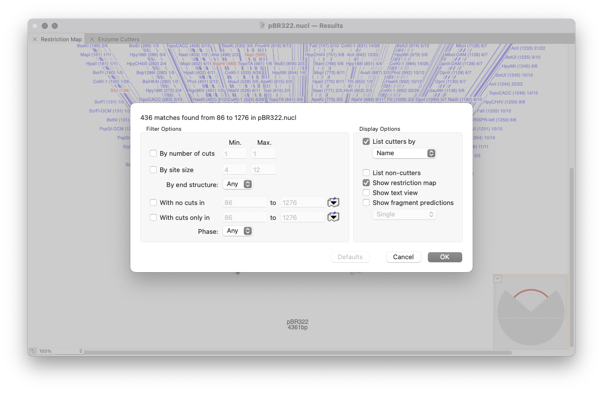 For example for Restriction Enzyme analysis the Filter dialog allows you to further refine the restriction enzyme recognition sites found, for example if you started with a broad search but now want to just show sites that are cut a certain number of times, leave a 3′ overhang or 5′ overhang, have a recognition site of a certain length or other filters. This is also useful if your initial search was too stringent and did not find any sites.