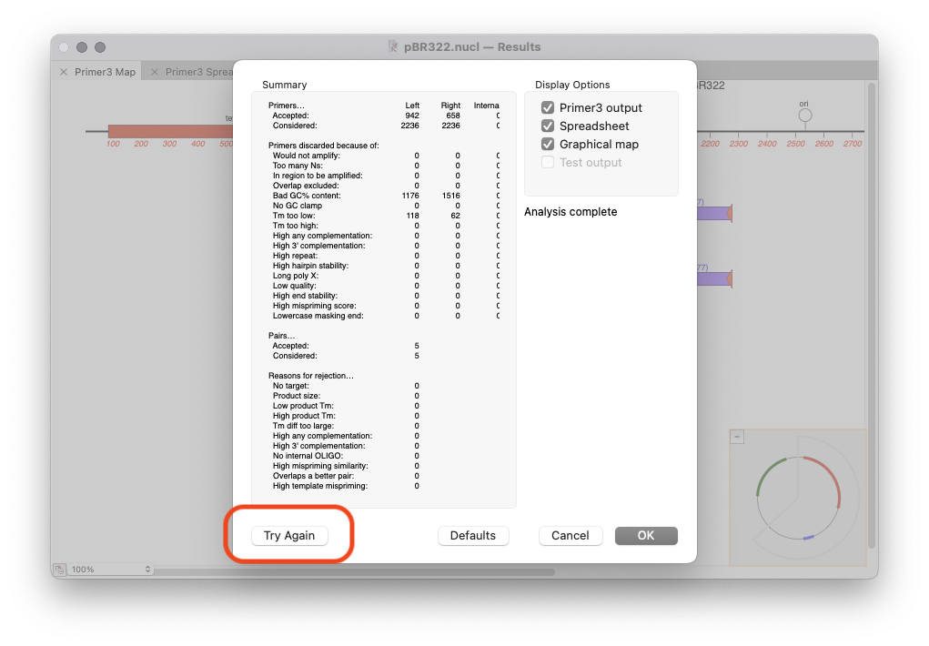 Some tools work slightly different. For example Primer3 will just show you the filtering dialogue with just output options but without any filtering options (as all options are in the initial setup dialog). But you can just click “RUN AGAIN” and the Primer3 setup dialog is shown with the settings exactly as the subsequent run with the same sequence range selected.