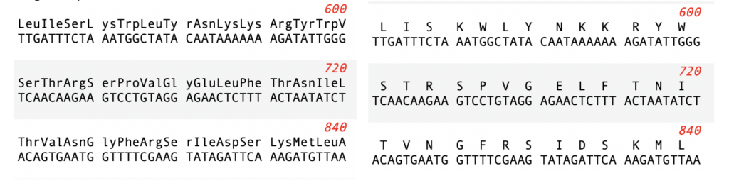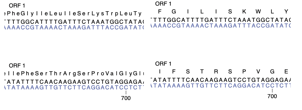 Many views in MacVector display amino acid translations above or below DNA sequences. Typically, these are from CDS features, but can also be the 3/6 frame translation of a sequence. You can display the amino acids as either the single-letter code, or as the three-letter code. You can toggle the setting using the MacVector | Preferences -> Text View pane.